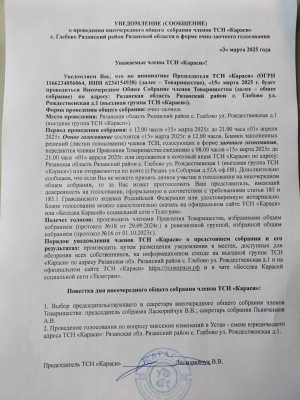 15 марта 2025 года (суббота) в 12.00 состоится внеочередное собрание по адресу : ул. Рождественская дом 1 (КПП). Цель - принятие решения о смене юридического адреса ТСН. Тем самым, мы с Вами экономим общие деньги за аренду офиса на ул. Соборной в размере 60.000 рублей в год. С уважением Председатель ТСН. Более подробная информация содержится в телеграм-канале ТСН "Караси" https://t.me/tsnkarasi и информационной доске на КПП.